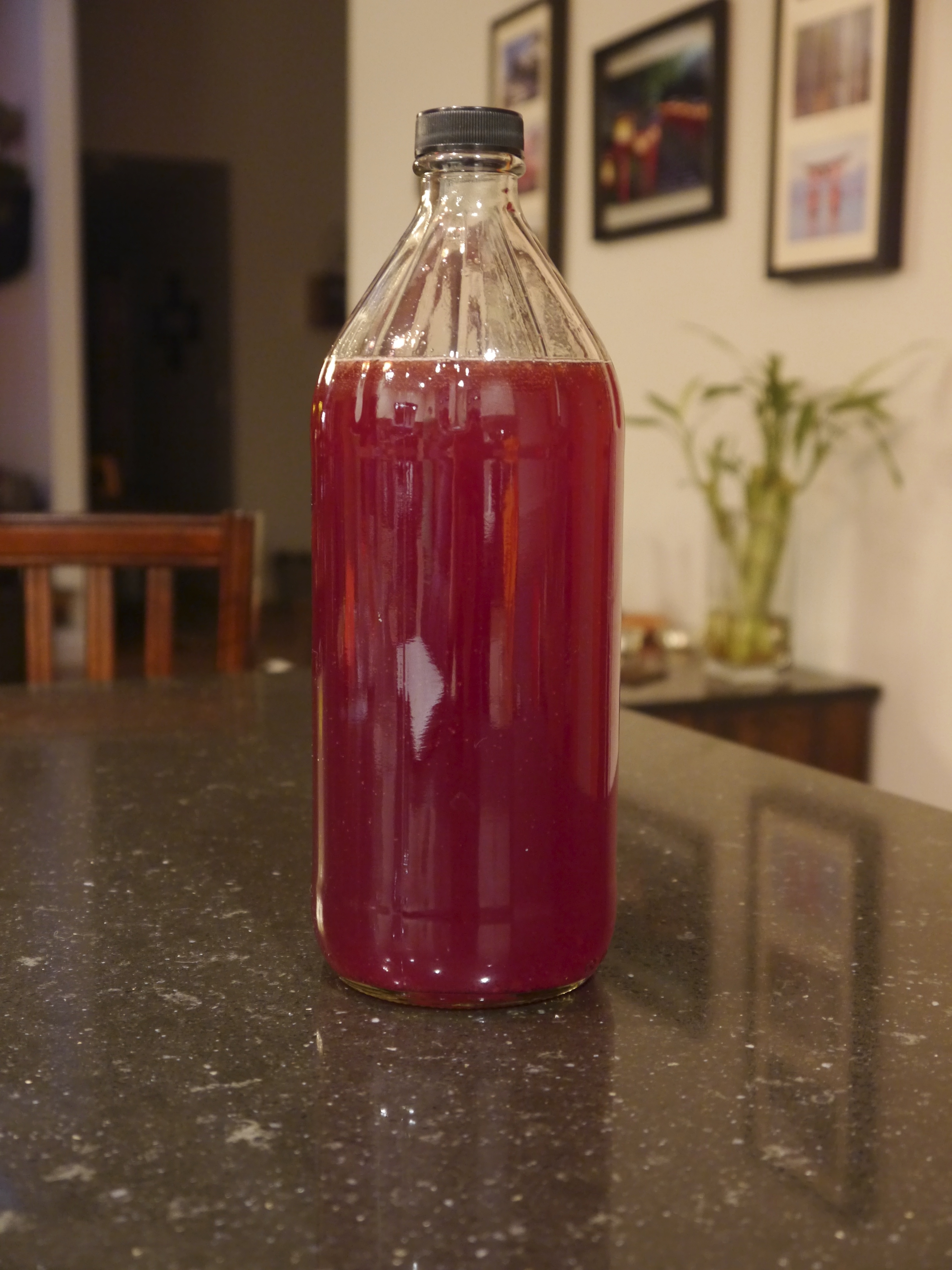The infusion ferment is done without airflow. I put the cap on, and let it ferment for 24 – 36 hours, depending on how fizzy I want it to be. During the fermentation process make sure to keep it warm, between 70 – 80 degrees is good. If it’s cool in your house, the perfect spot to keep it is in your oven, with the light on. If you notice, I’ve left some space in my bottle, to be sure it doesn’t overflow during this infusion process. Here’s my bottle with the fruit infusing.