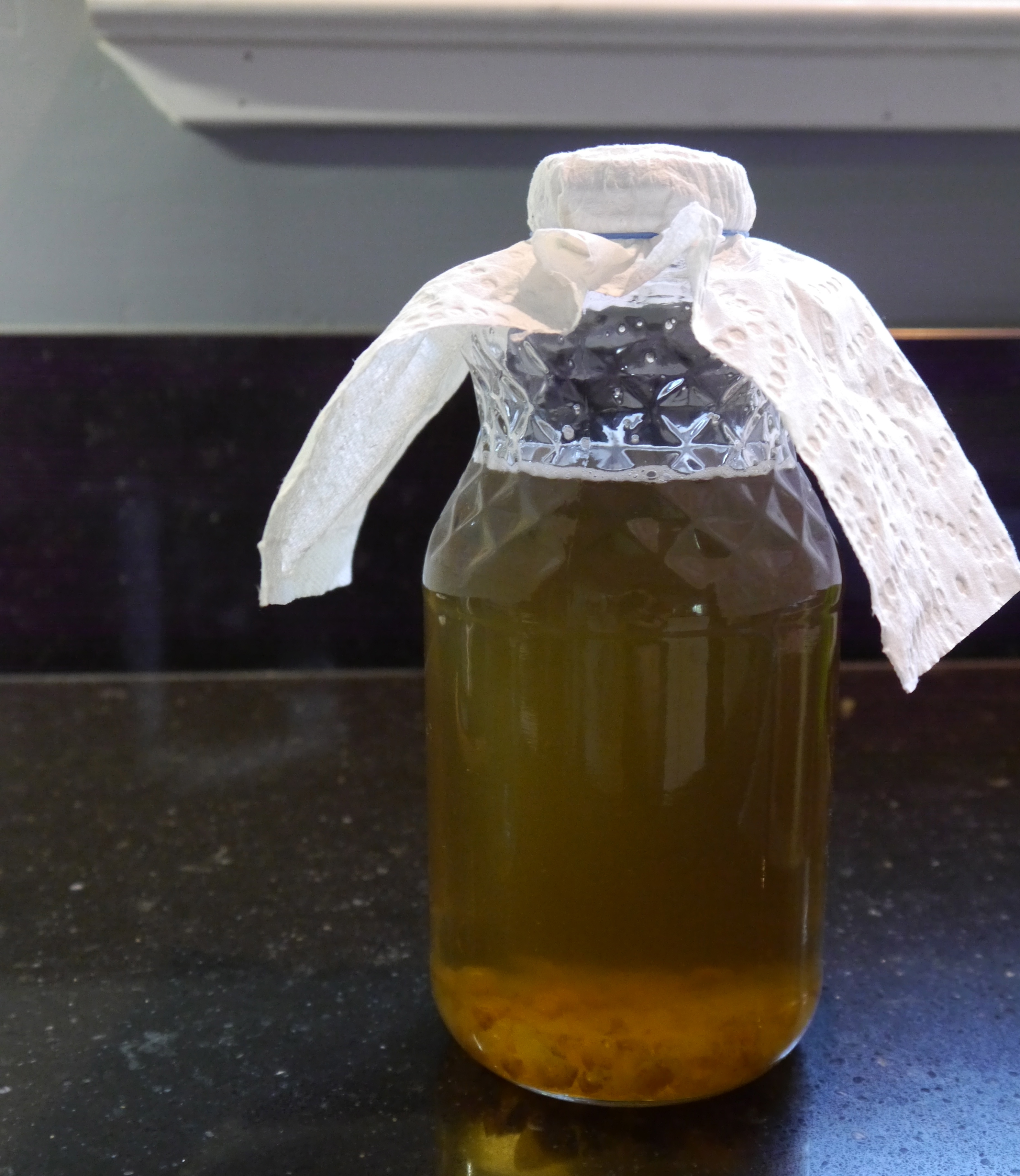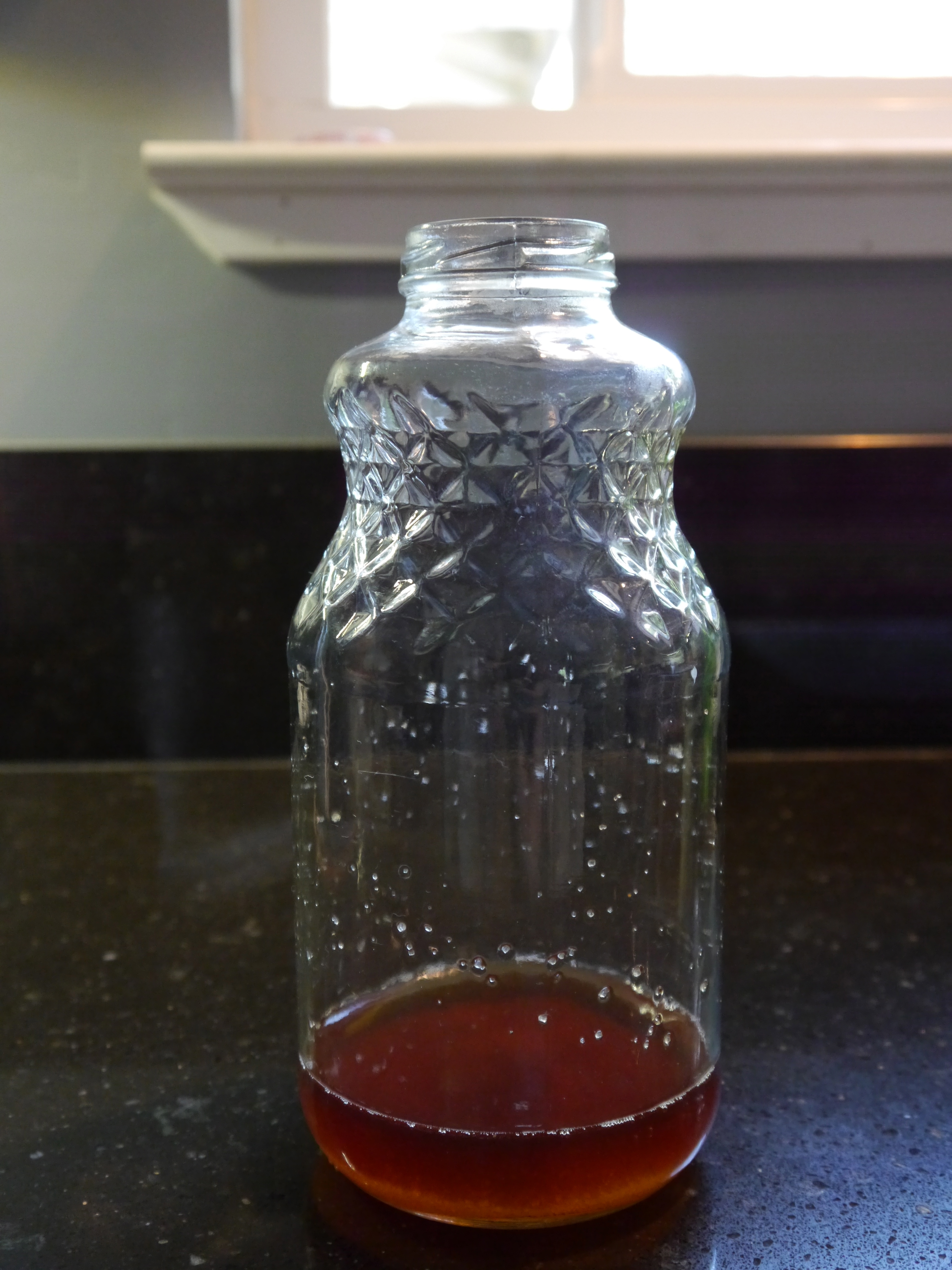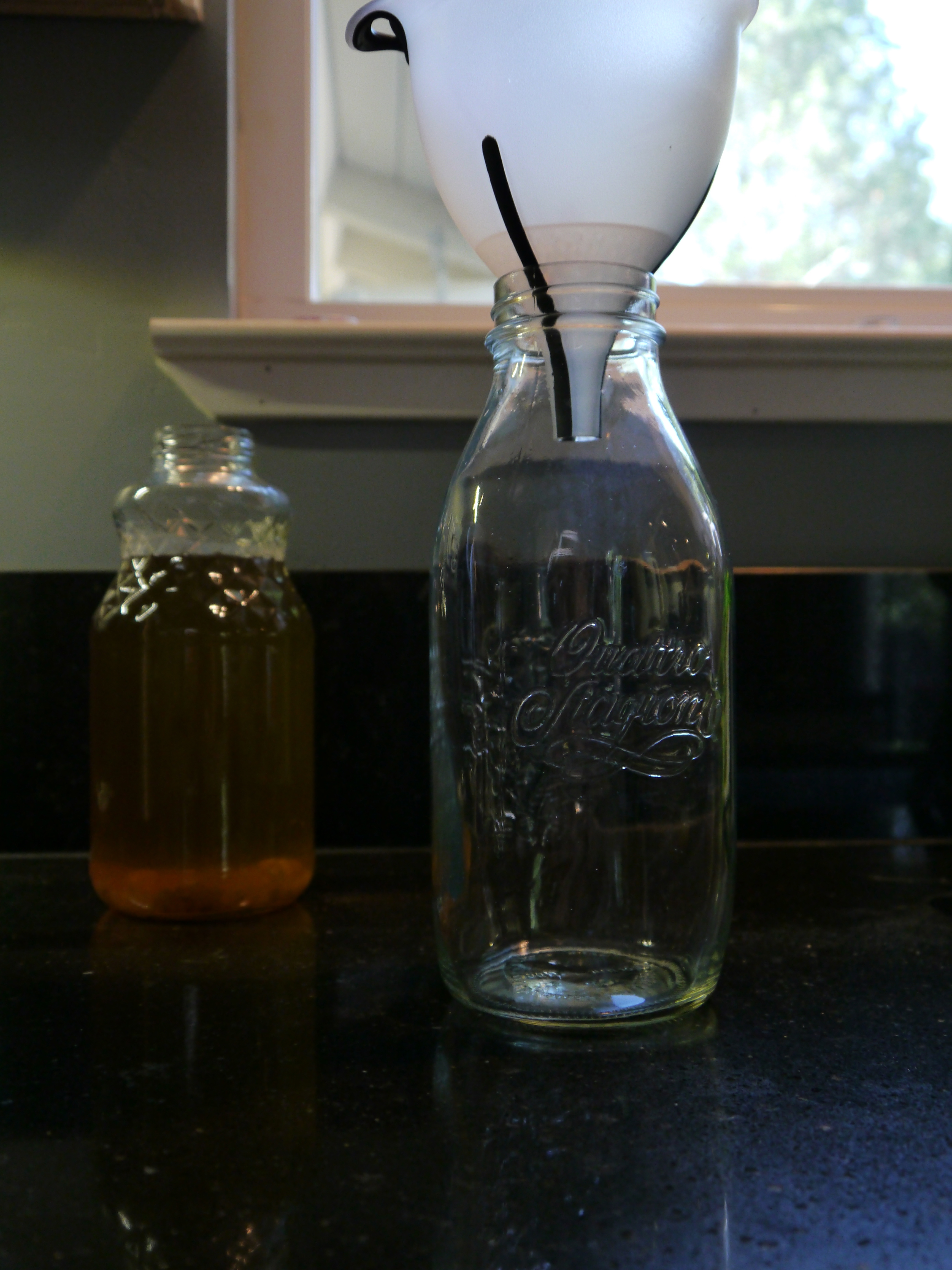 Now I need to get a another batch going by starting the first ferment process again. My husband and I drink quart of kefir almost everyday, so I always have a batch fermenting. The first ferment only uses sugar and water. I heat up about 1/4 cup of water in my tea kettle, and then add 1/4 cup of sugar.  I shake it gently to help most of the sugar dissolve. At this point, the kefir grains haven’t been added yet, because hot water is harmful to them.  Here’s a picture of the hot water, and sugar mixture in the bottle Sugar dissolving in water It’s almost time to add the kefir grains, but first I add about 3 3/4 cups cool water to the hot. It’s not necessary to measure the exact amount of water, roughly a quart of water is perfect. Once the cool water is added, and the water is near room temperature, the kefir grains can be added. I use a small spoon to add them, if my funnel had a pour spout I’d just use the funnel.