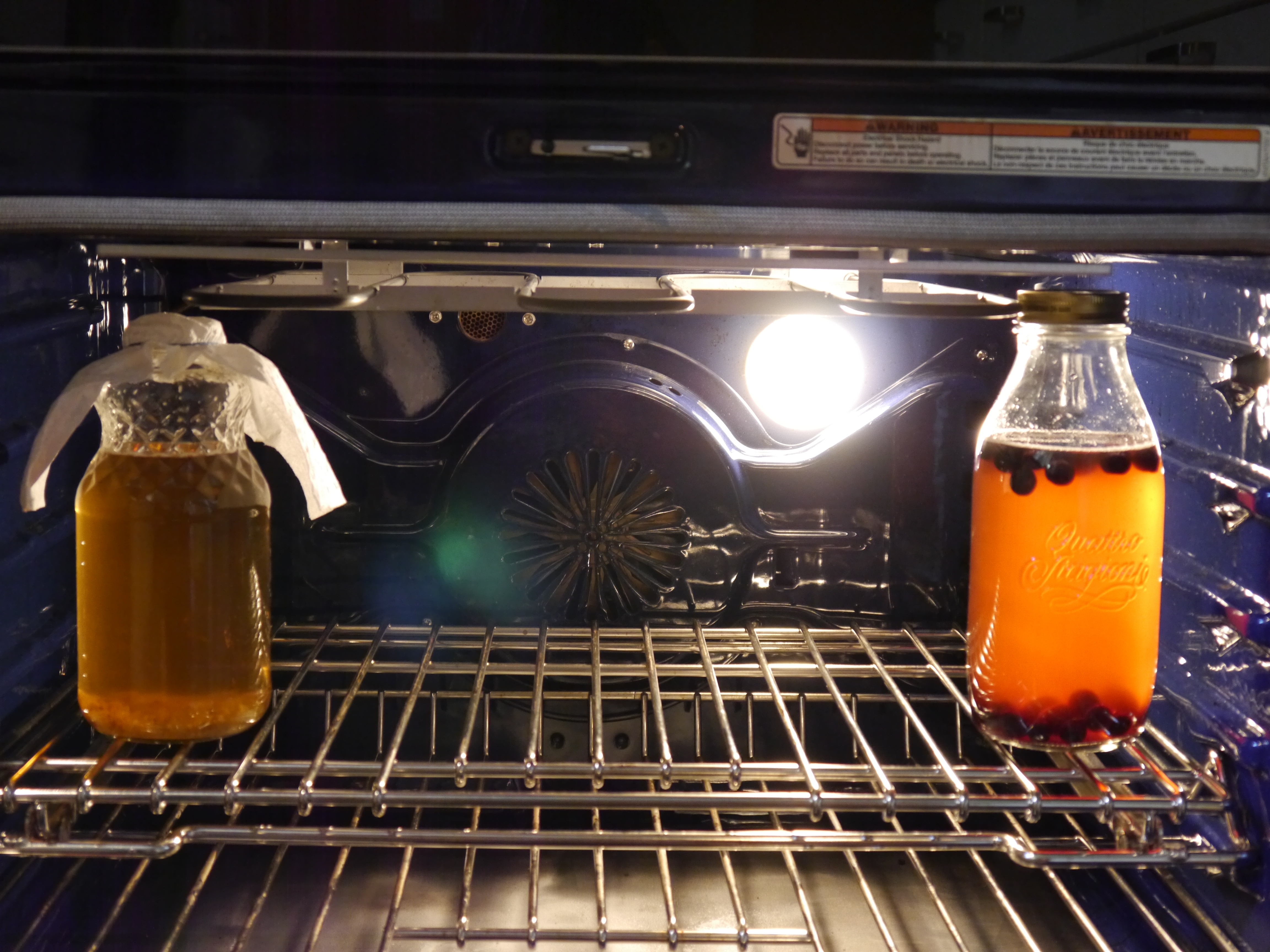 And here’s both the first ferment, and infusion in the oven, staying warm!