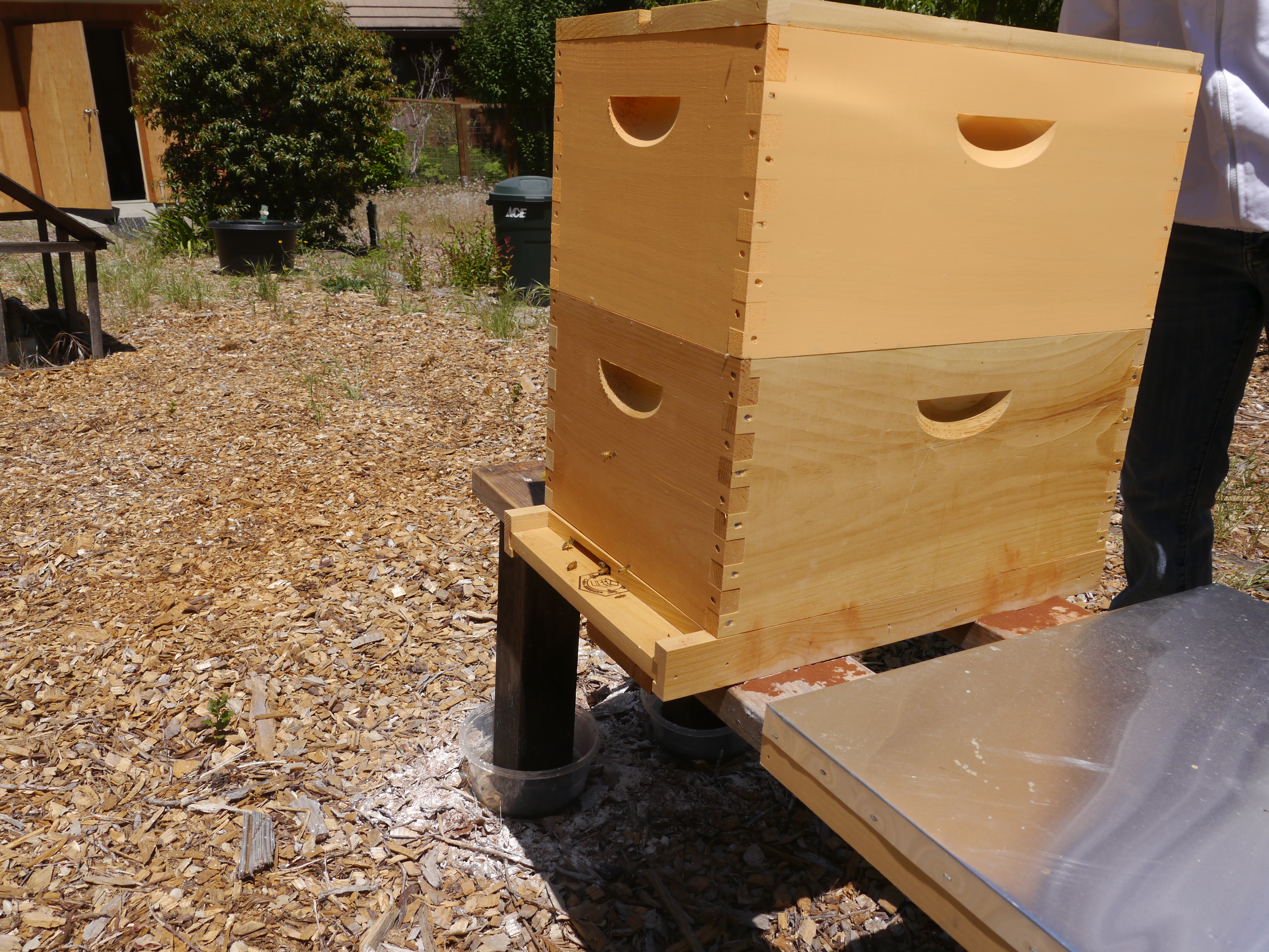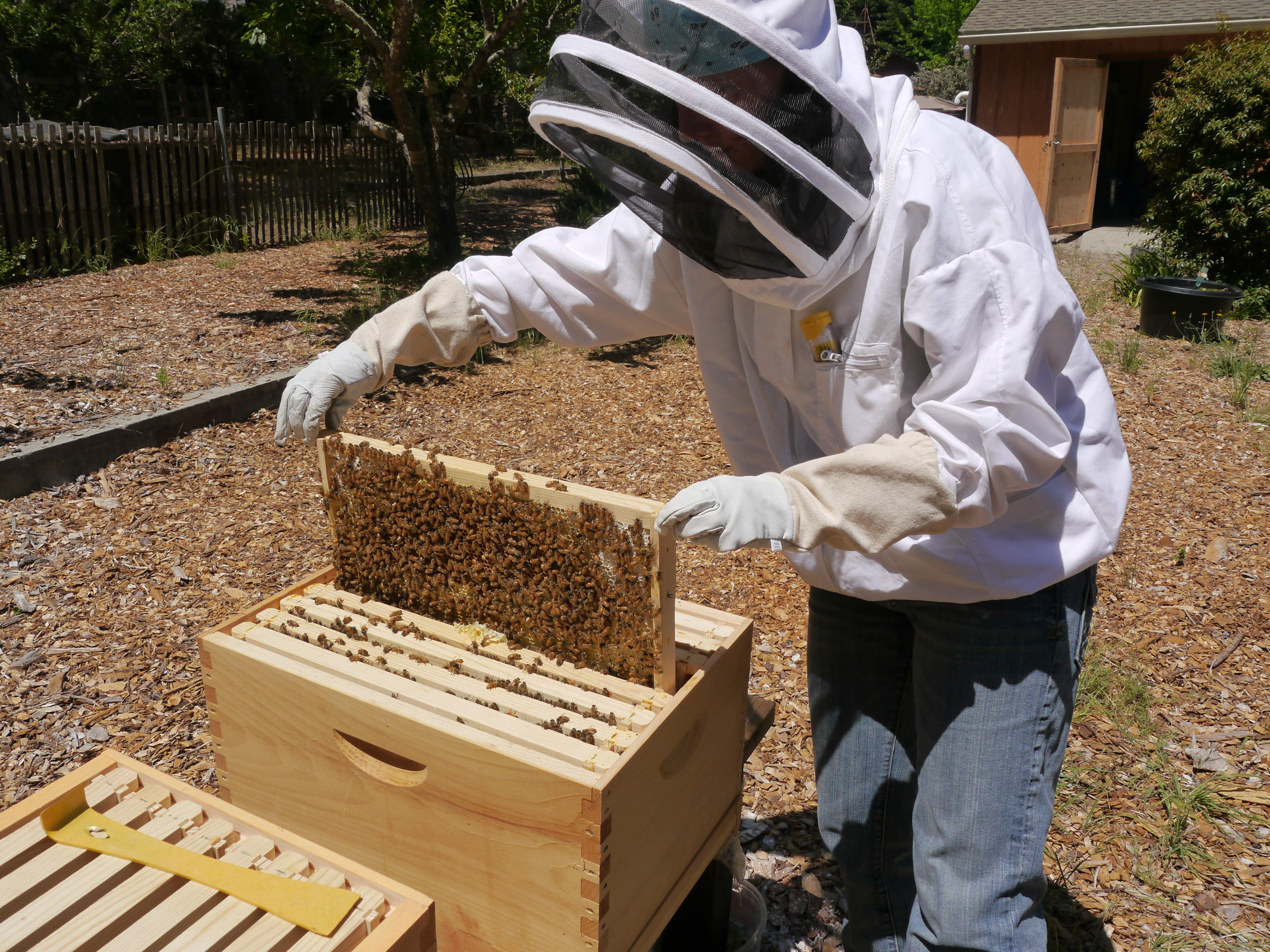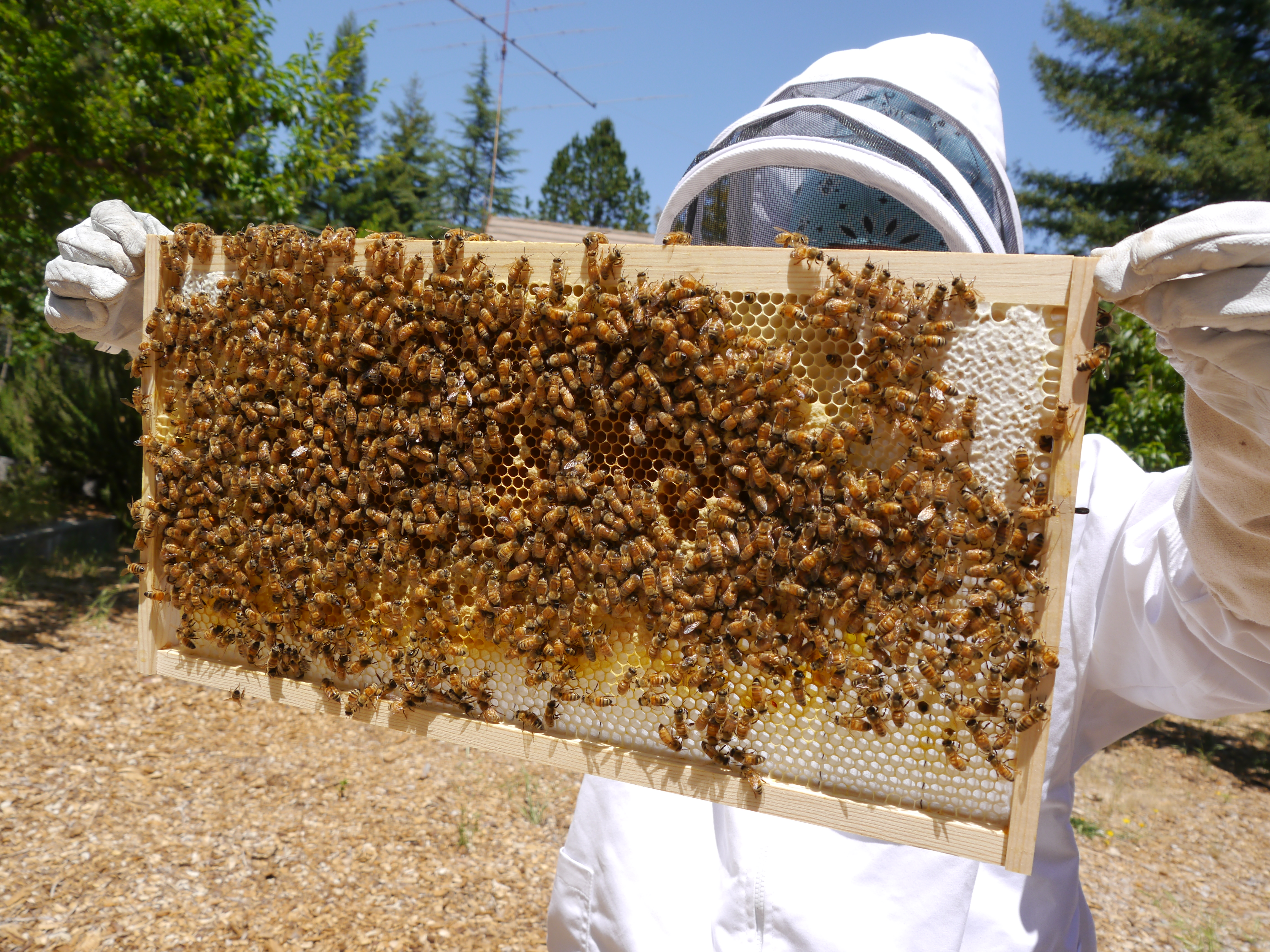They feed with I give them, and forage. They are very busy foraging during the day. Since it’s been a dry year, the nectar flow was short, and our area usually has a short nectar flow compared to the inland Bay Area. If I don’t feed them while it’s warm, they won’t make enough honey to survive the winter, and the hive will die. This hive was started from a package of bees, that had virtually no immune system. They need to be feed a lot to help build up the health of the hive, and feeding helps them make comb so the queen can lay eggs. We’d love to have you visit!