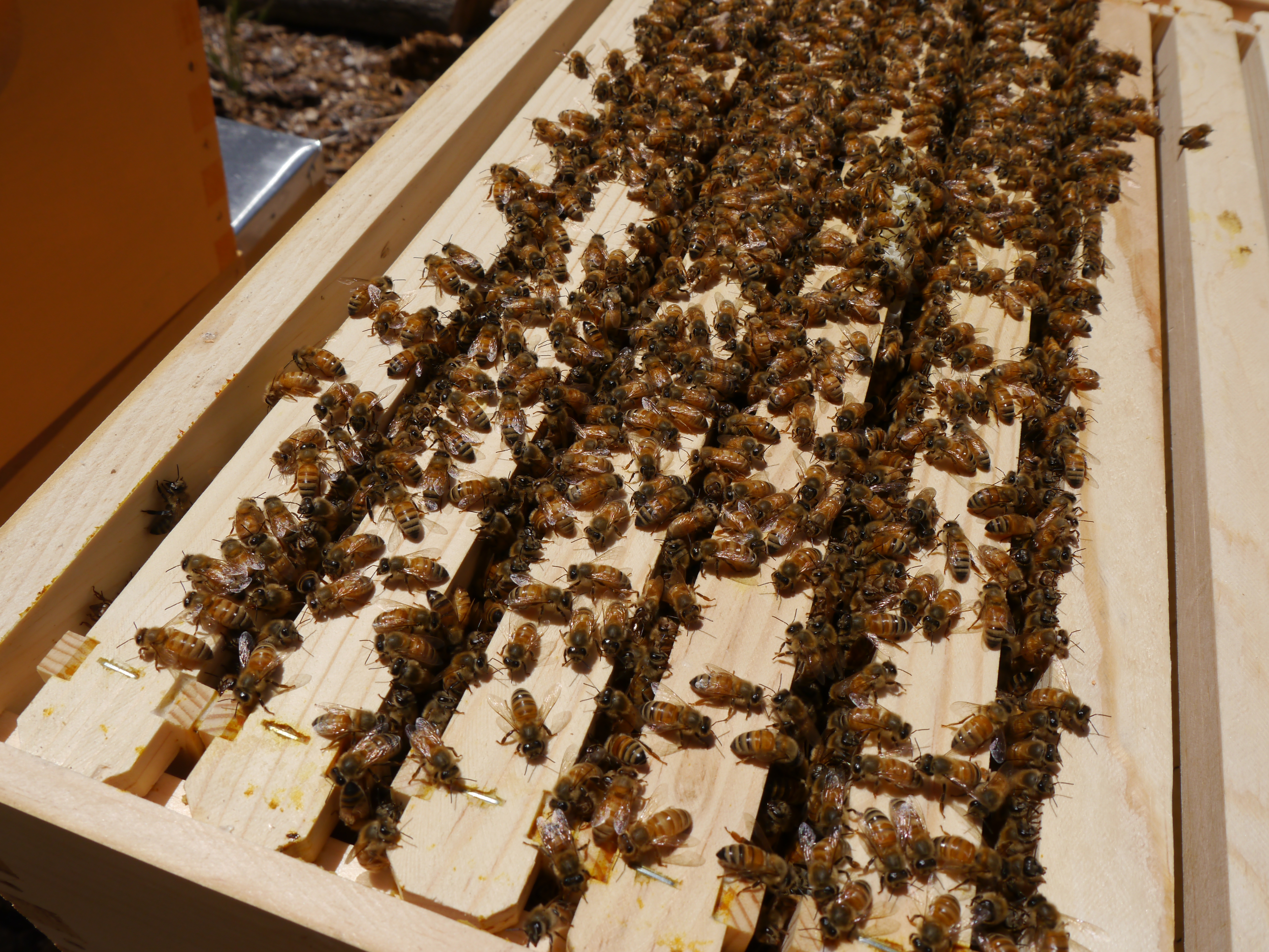 I was very excited I got to see the queen, and all the other activity going on inside. My excitement was replaced with a bit of disappointment when I realized I’d smashed two bees. When a bee is killed, it can sometimes release an alarm pheromone. I definitely think this happened after I smashed them because the activity, and sound level of the bees increased. There were also a few bees checking on the smashed bees. I felt so bad! Based on the mood of the hive, I decided it wasn’t the best time to feed them, and I’d been out there at least fifteen minutes, so it was time to go! The next day I was able to install the entry way feeder without any issues.