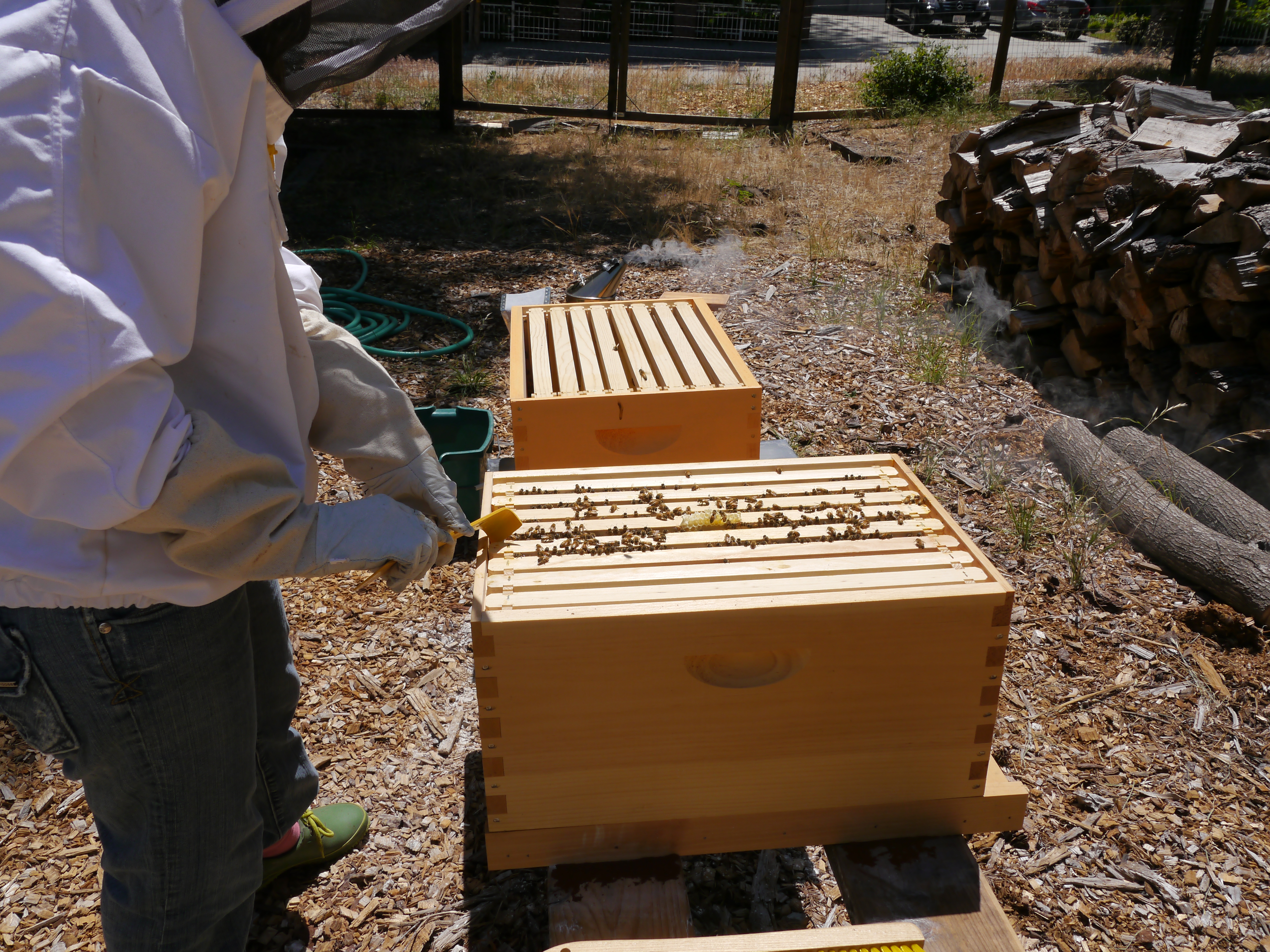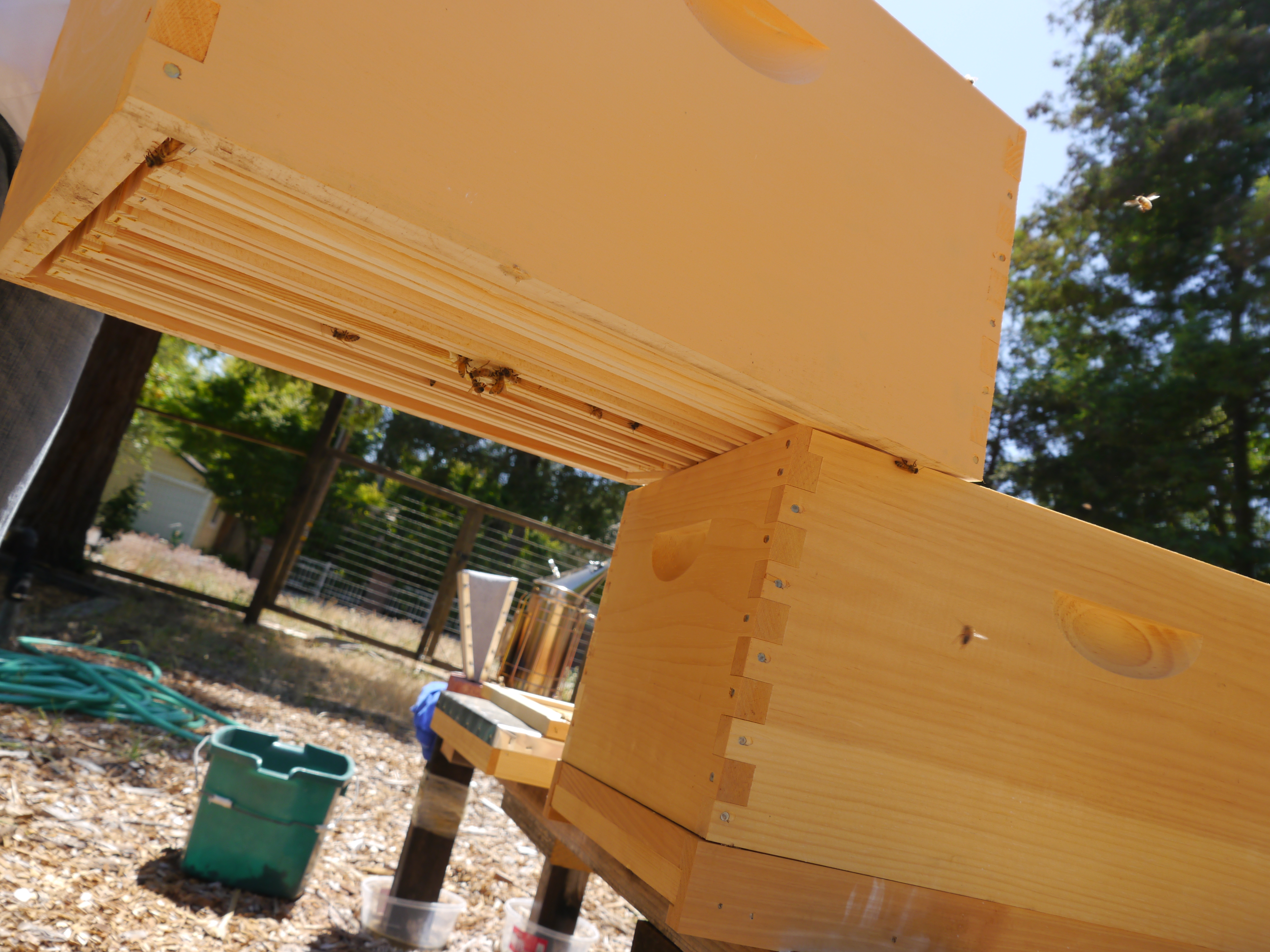 Replacing the top box. This is how I smashed two bees 😦 Even though I moved slow, they were underneath the front edge when I put it down.