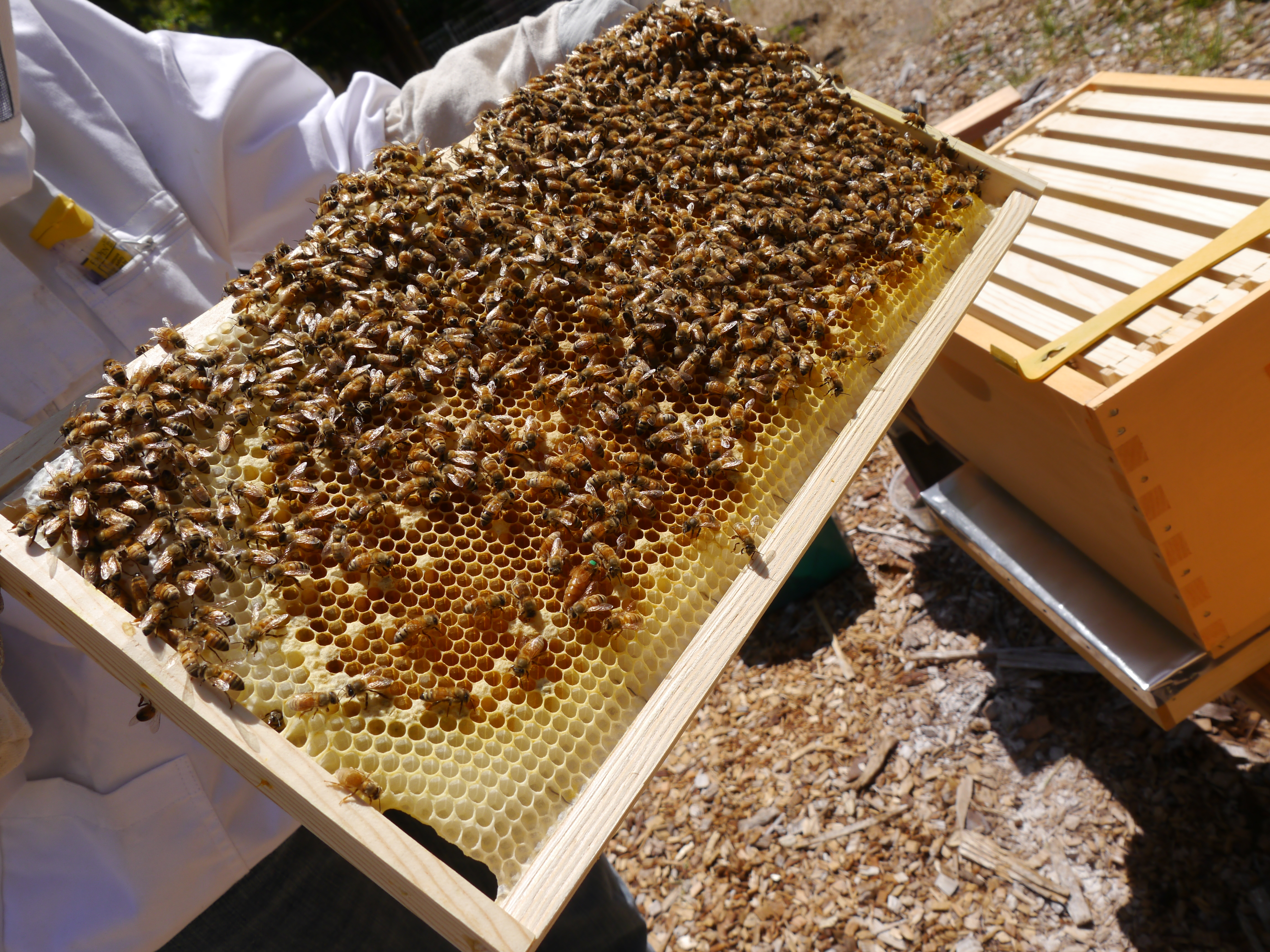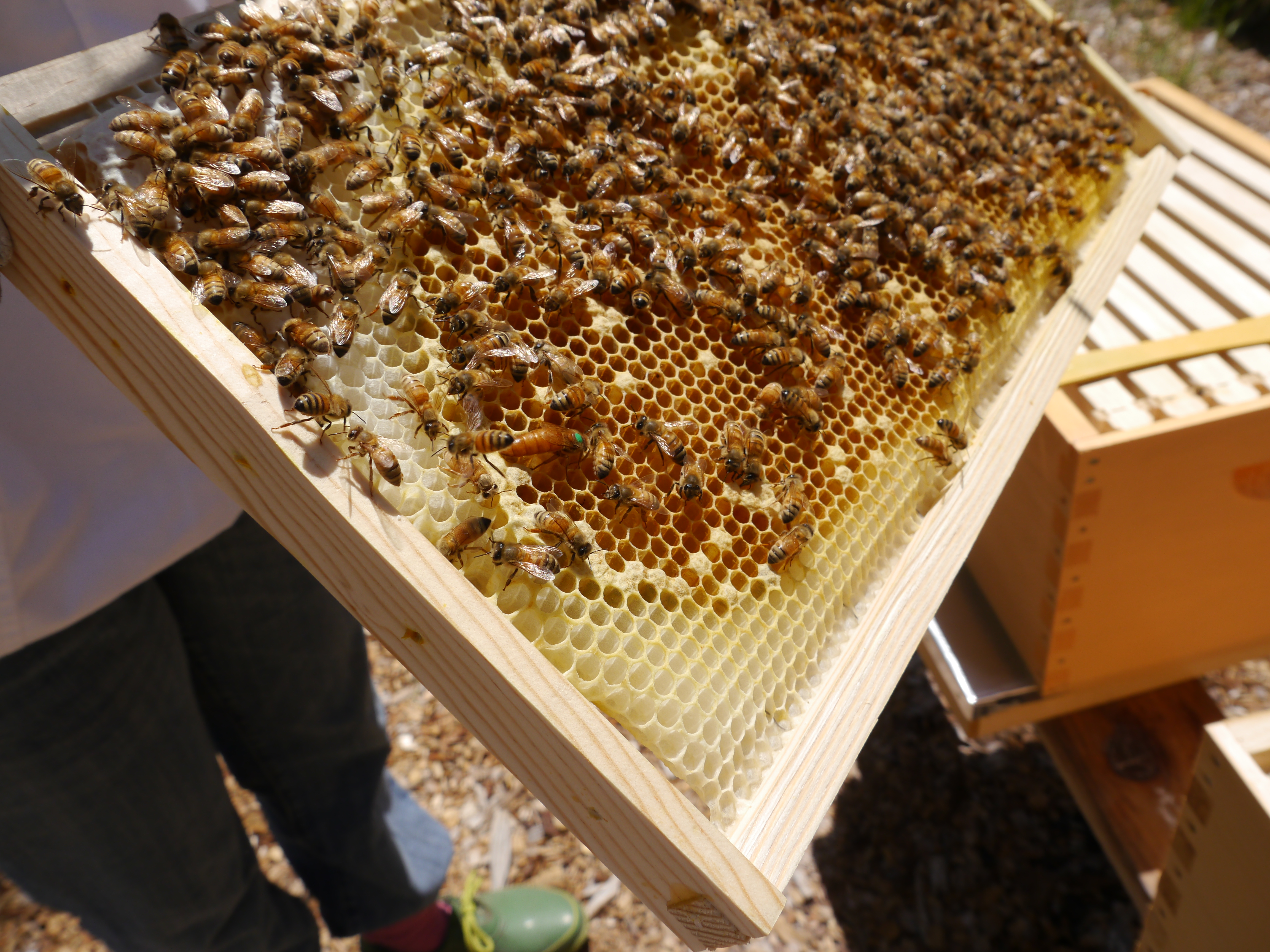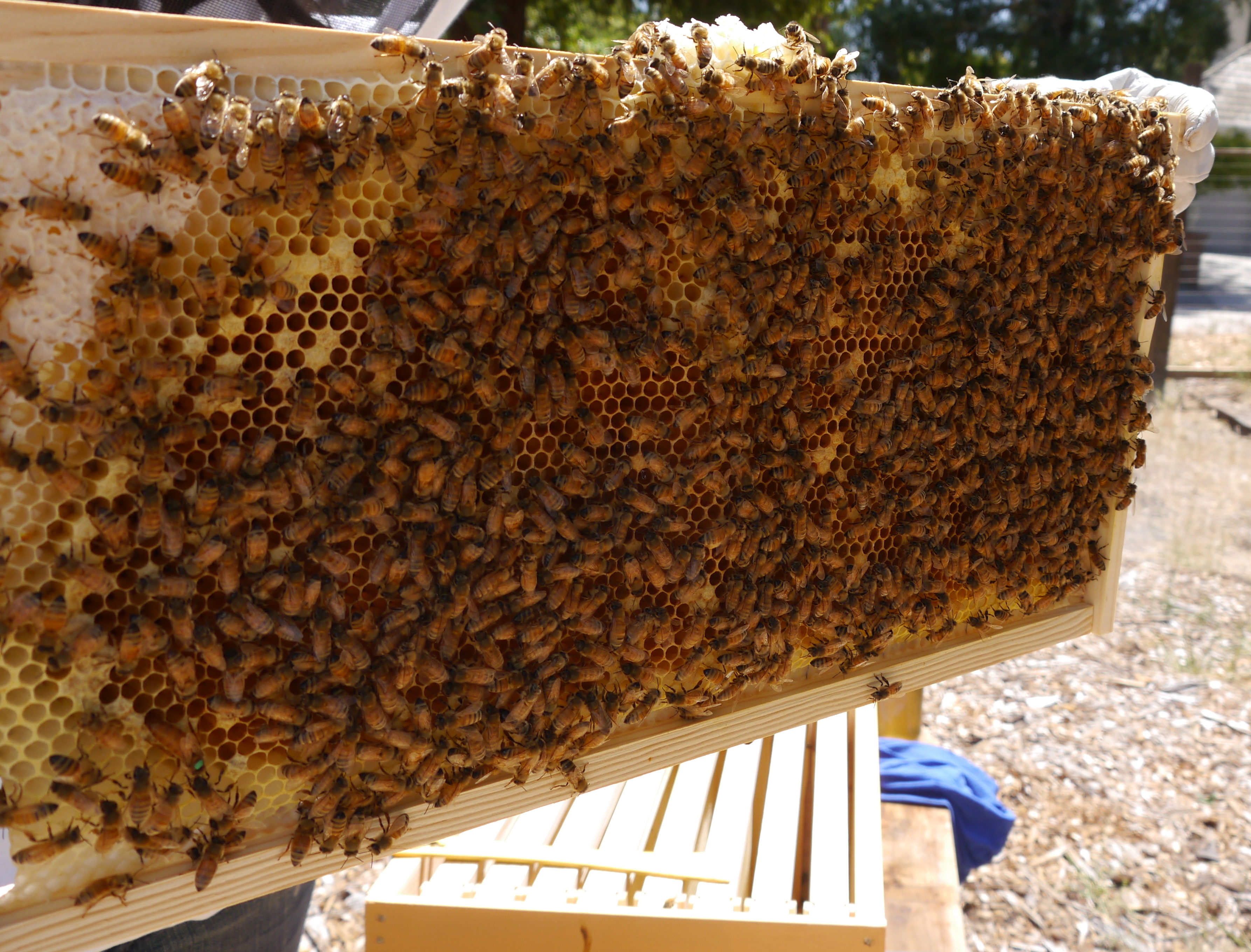 A frame near the edge, much less activity. I’m sure they’ll fill it up soon. A tiny bit of uncapped honey in the left corner.