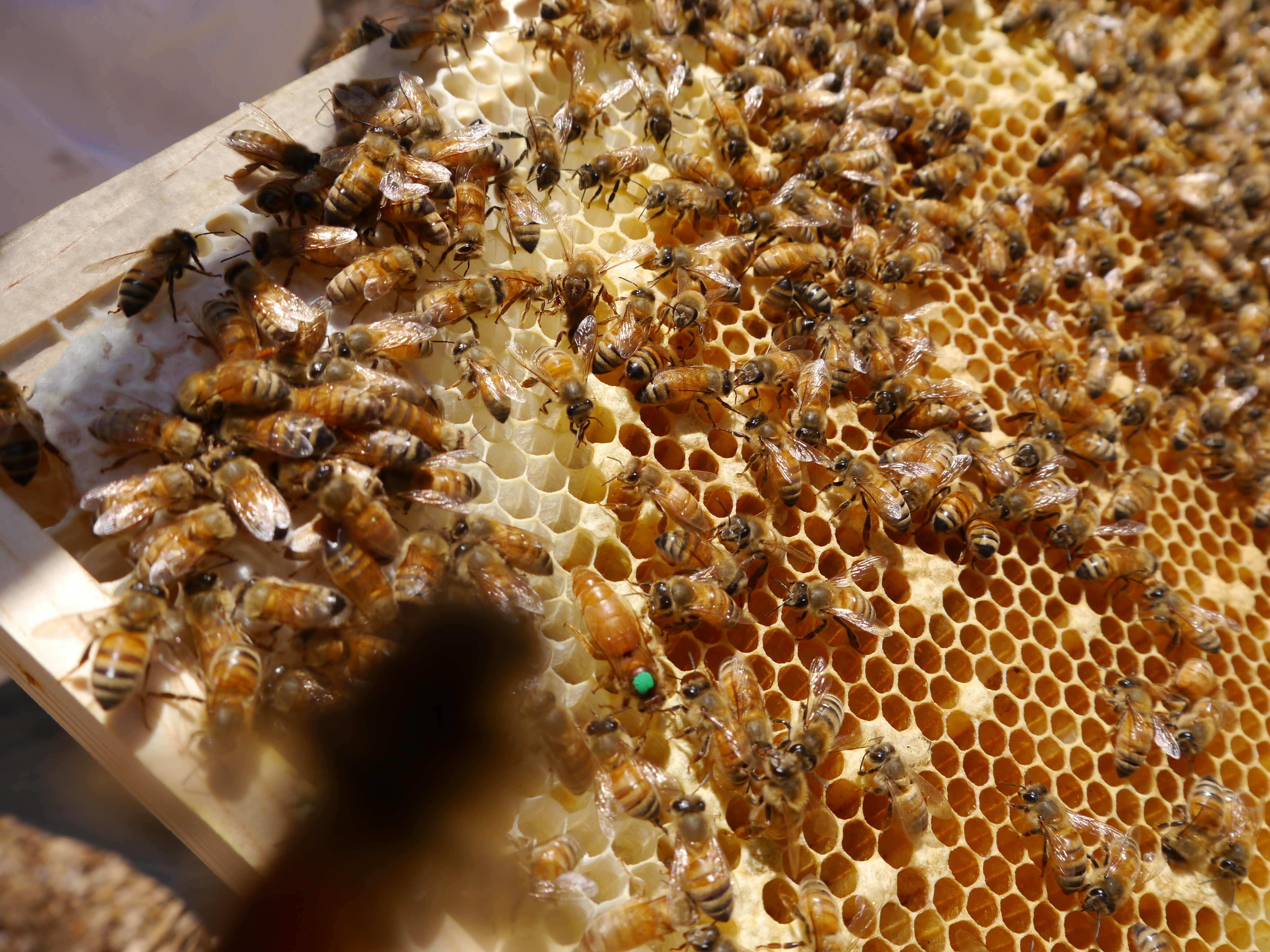 Lorde, the queen is in the lower left corner. She’s the big bee, with the green dot on head. You can also see how short her wings are compared to the other bees. This frame also has honey in left corner, and you can see some capped brood to the right of the honey.