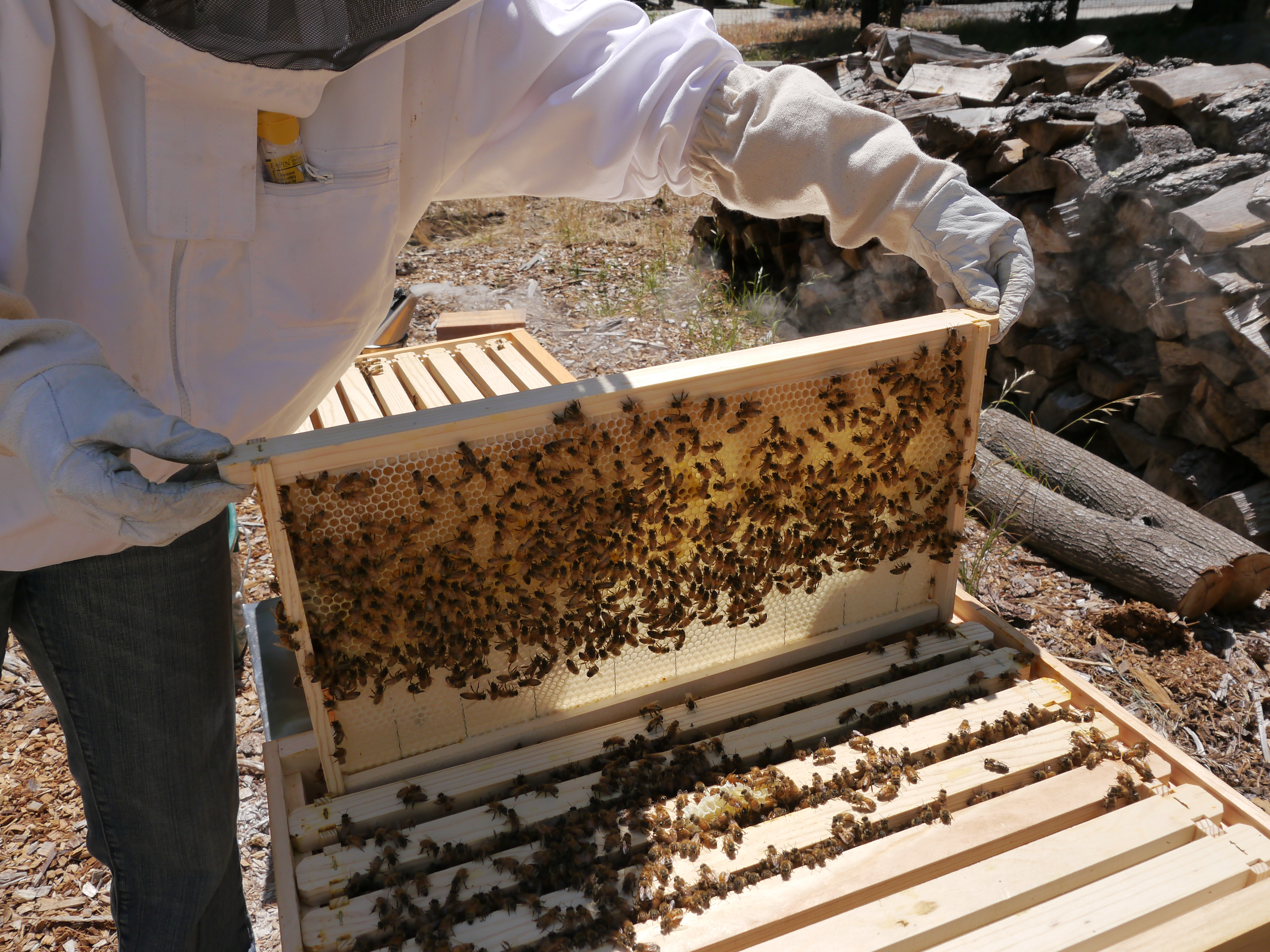 Slowly removing one of the middle frames. The queen is typically on the middle frames, so it’s important to be careful.