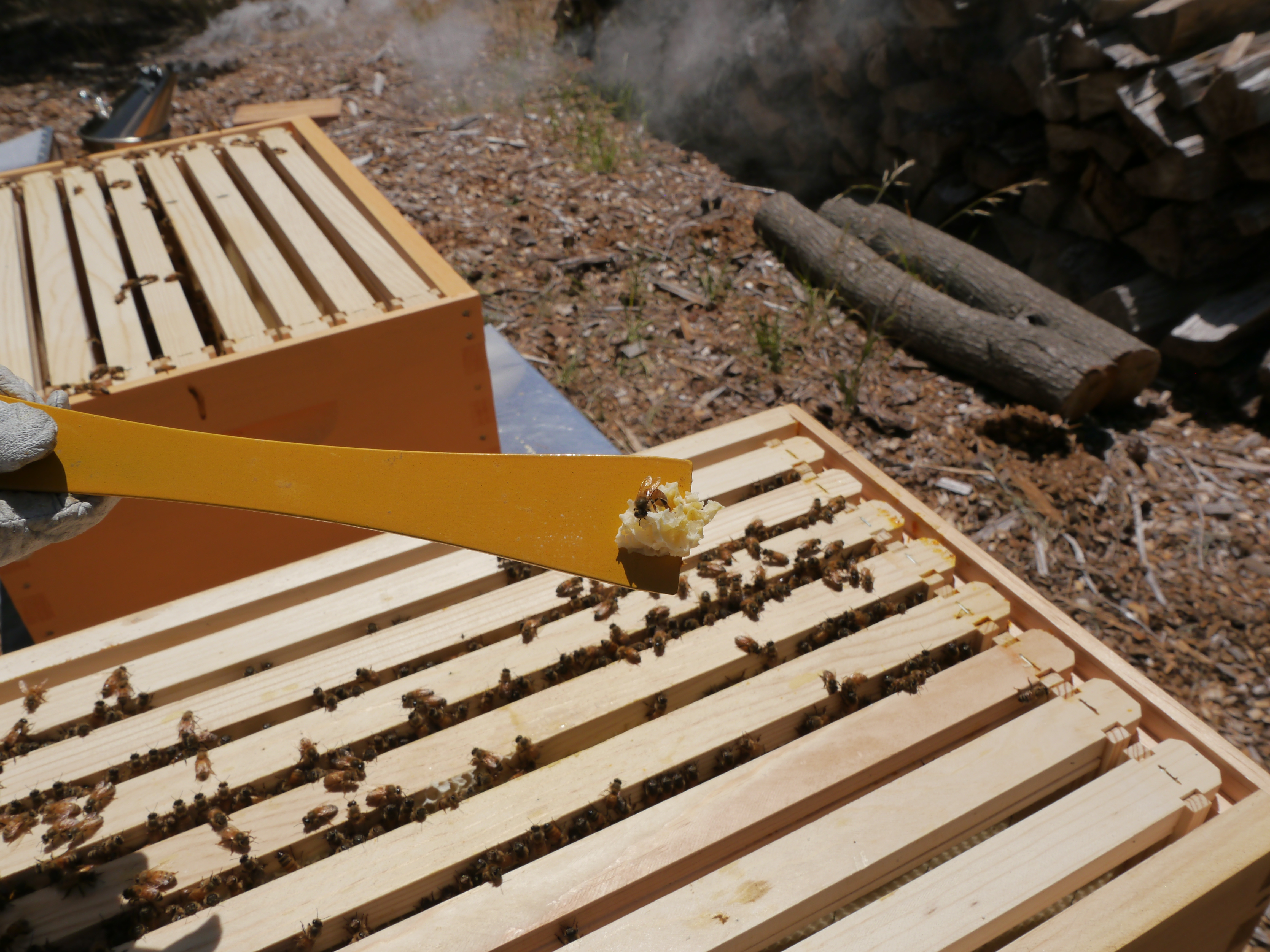 I’m using my hive tool to move the frames for easier access. There is extra comb they’ve built in the middle of the hive.