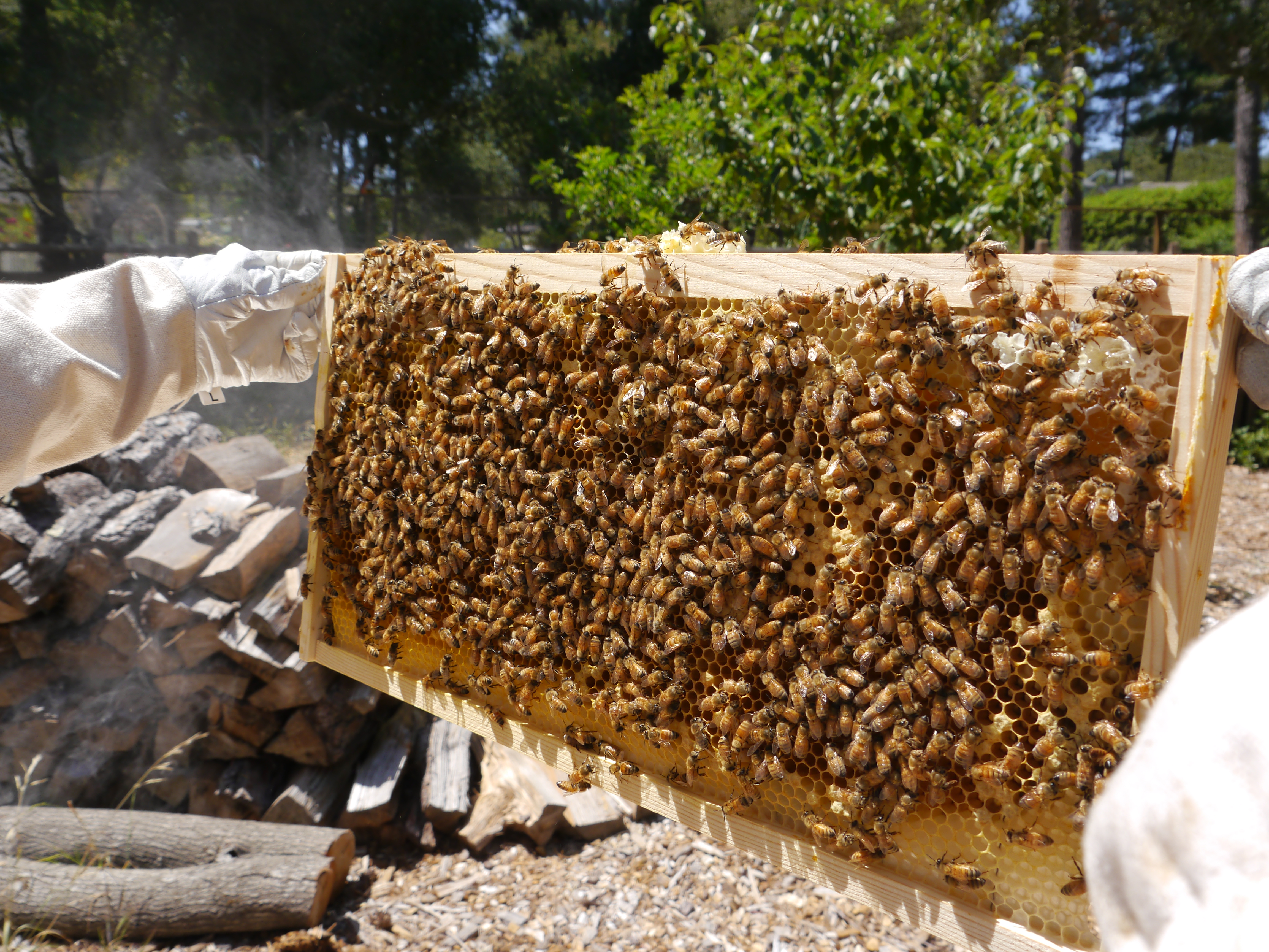 For comparison, here’s a frame from Verbena hive. Notice the difference in the amount of bees and brood ? There is less capped brood because they are waiting for the queen to lay eggs, then they cap it, and let the new bees develop.