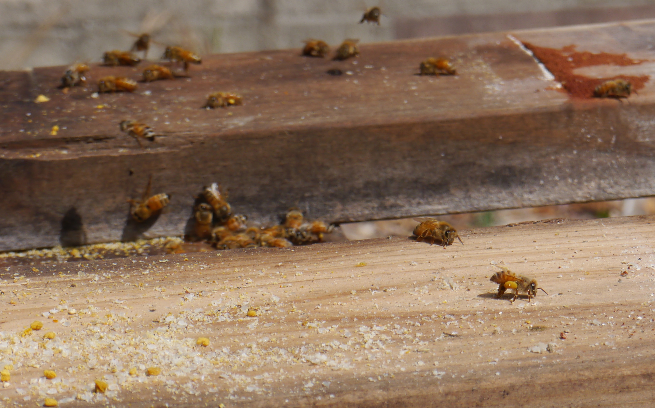 The bee in the lower, right corner has a full pollen basket on it’s hind leg. The other bees were busy cleaning up the pollen.