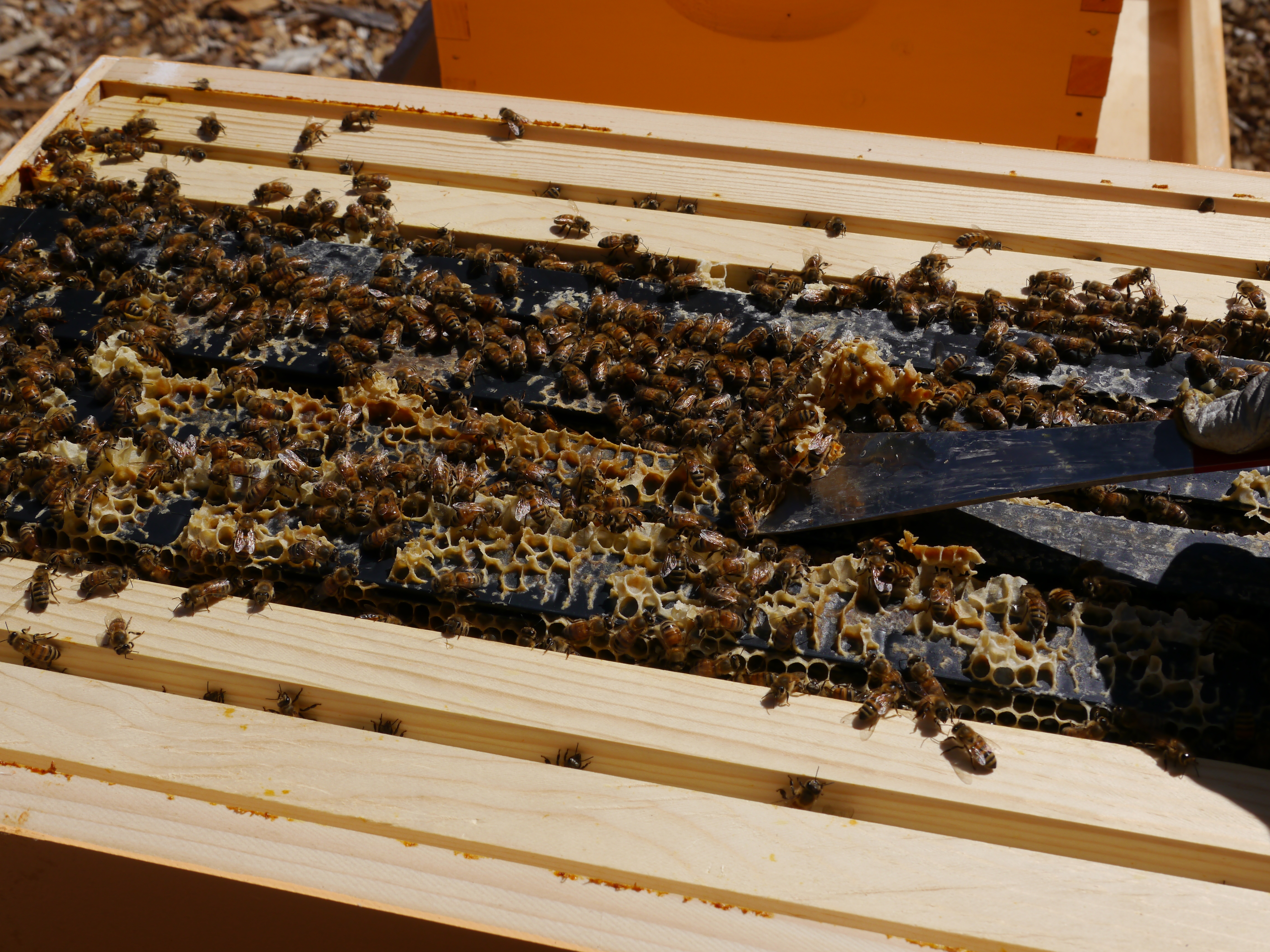 I’m happy to report the following week my Cosmo colony was nice, and quiet. They had eaten almost the entire gallon of syrup! I was amazed by the difference in their behavior. Lesson learned, fed bees are happy bees! They also had some burr comb built up that I cleaned off because the top and bottom supers were almost stuck together. Burr comb is a result of a bee space violation. I need to figure out why it’s happening in this colony. My best guess, is the frames that came with the nuc are not a good fit for my super. At some point, I should probably swap out frames, but I need to read up on how to do that first. In the meantime, I’ll just keep removing it as needed, here’s pictures of me cleaning it off.
