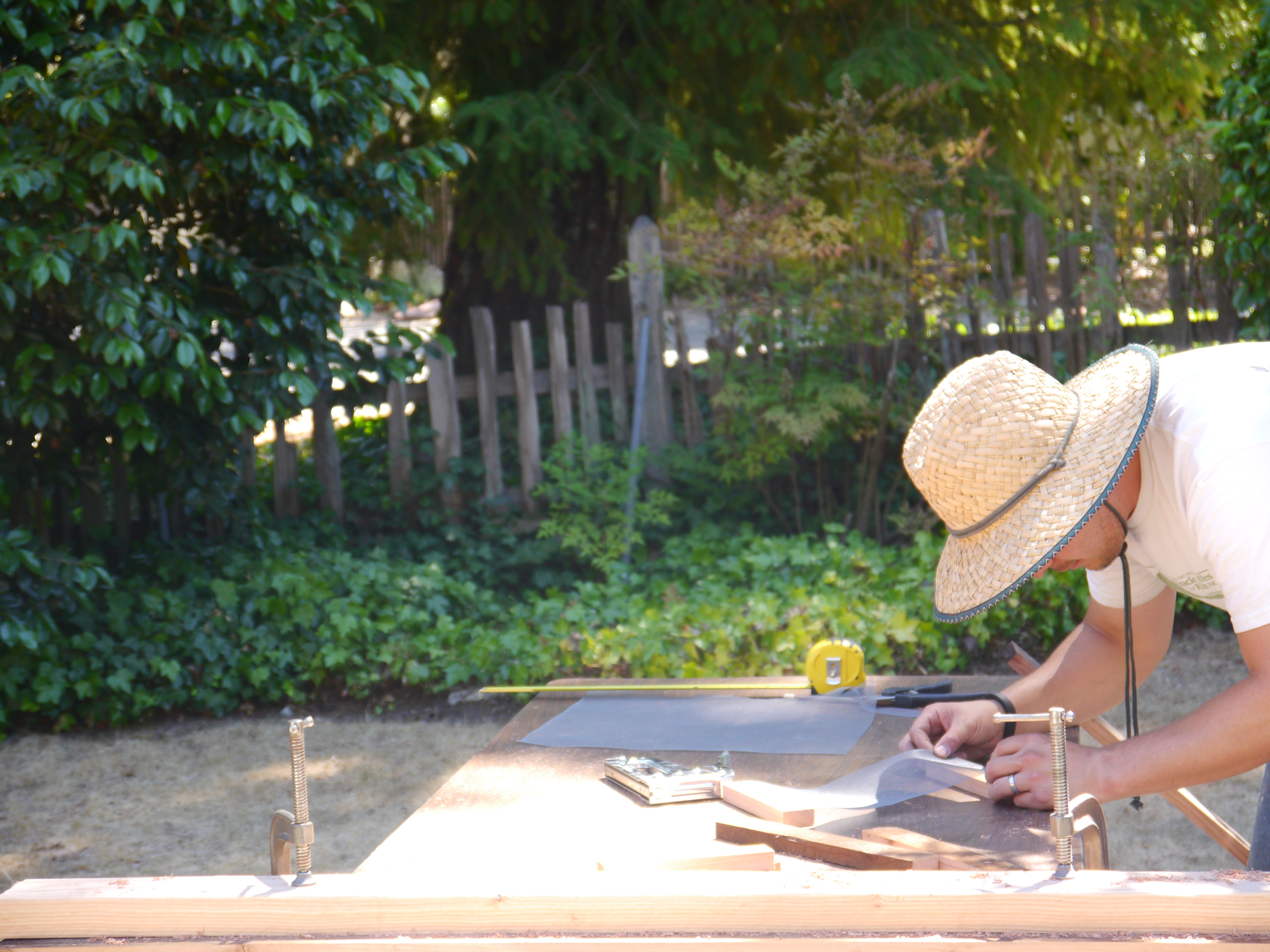 The robbing screen was easy, and inexpensive to make. He found this video and built a similar version for my colonies. We had some extra wood around the house, so the only thing we needed to buy was the screen material. It was easy to find at our local Ace Hardware store, and cost about $3. He measured the width of the colony entrances and they were a perfect fit! These pictures show him making the screen, and the finished product.